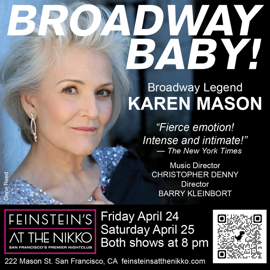 Karen will be performing her newly acclaimed show, Broadway Baby at Feinstein's at the Nikko in San Francisco on Friday, April 24 & Saturday, April 25, 2026. All shows at 8pm. Click Here for tickets!