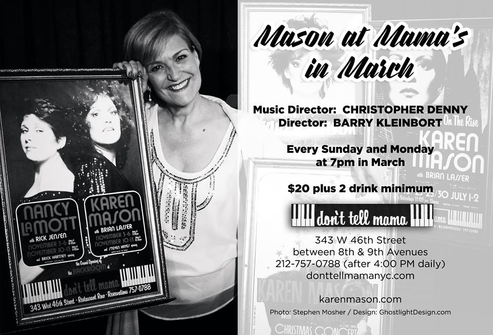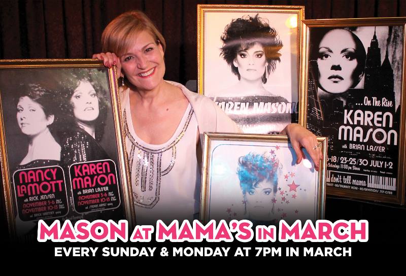 Karen's new show Mason at Mama's, a weekly show at NYC's famed Don't Tell Mama, features new arrangements of classics, new songs and some of the music Karen and her longtime composer/arranger Brian Lasser performed in those early days at Mama's!